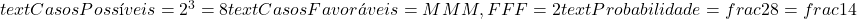text{Casos Possíveis} = 2^3 = 8  text{Casos Favoráveis} = {MMM, FFF} = 2  text{Probabilidade} = frac{2}{8} = frac{1}{4}