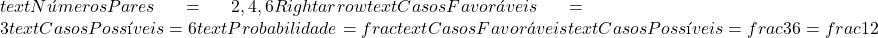 text{Números Pares} = {2, 4, 6} Rightarrow text{Casos Favoráveis} = 3  text{Casos Possíveis} = 6  text{Probabilidade} = frac{text{Casos Favoráveis}}{text{Casos Possíveis}} = frac{3}{6} = frac{1}{2}